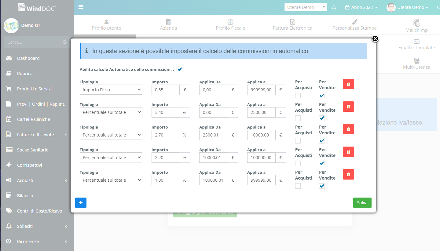 Per ogni conto troviamo il pulsante rosso. Cliccando sul pulsante possiamo abilitare il calcolo automatico delle commissioni e definire le regole.