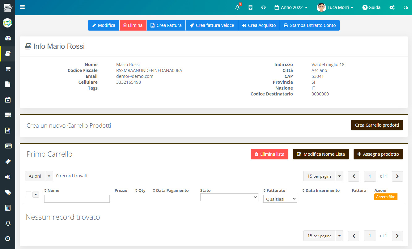 All’interno dell’anagrafica di ogni vostro contatto trovate la possibilità di creare uno o più carrelli, funzione utile per diversificare i prodotti. Per creare un nuovo carrello prodotti è sufficiente clicca sul pulsante “Crea Carrello Prodotti”.