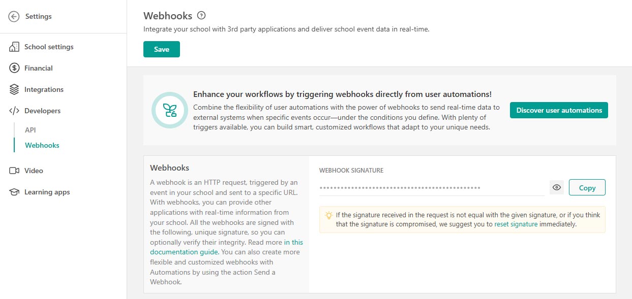 Nel campo Webhook Signature inseriamo il primo codice recuperato da LearnWorlds (“Webhook signature”) e nel campo ID Scuola inseriamo invece il secondo codice, ovvero lo “School ID”.