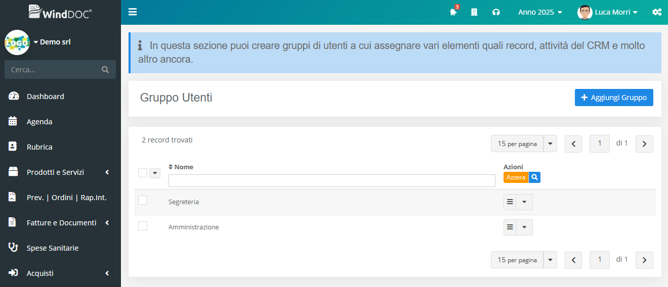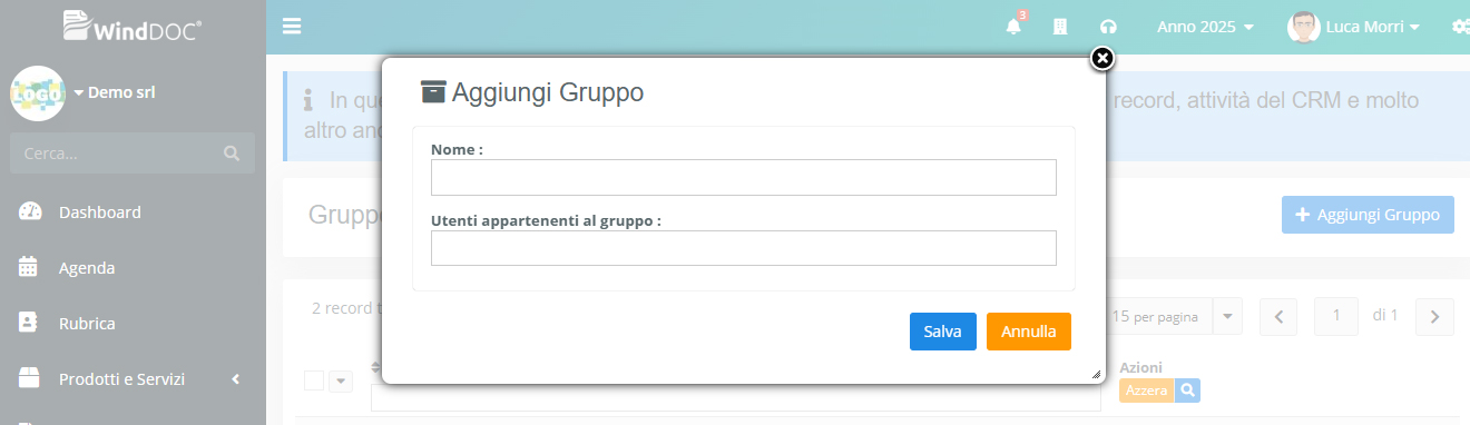 In WindDoc è possibile configurare gruppi di utenti a cui assegnare specifici record. Questa funzione consente di organizzare in modo più efficiente l’azienda o l’associazione, stabilendo con chiarezza quali ruoli hanno accesso a determinati dati e quali no.