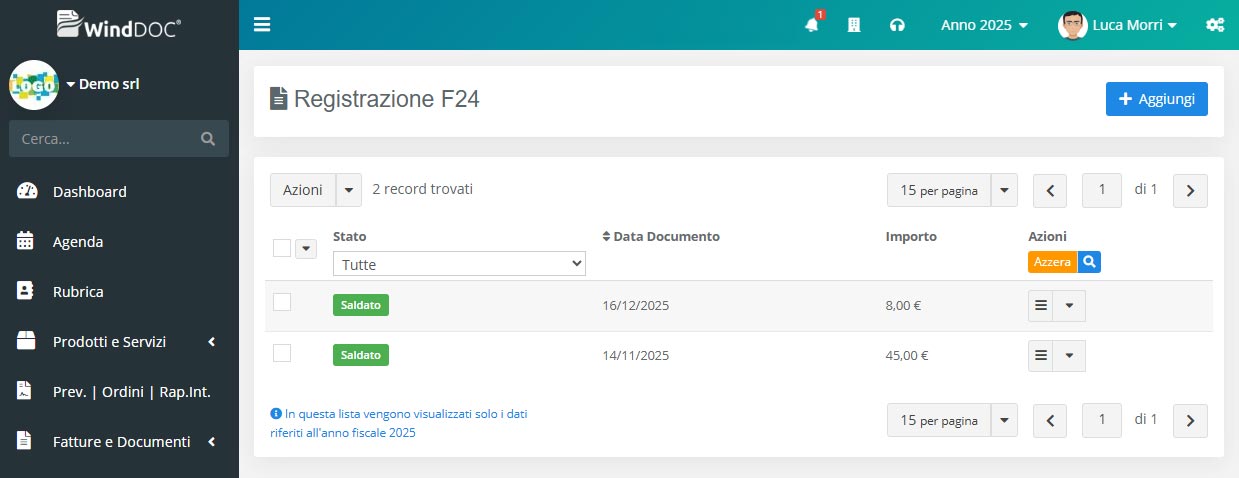 In WindDoc abbiamo realizzato una gestione che consente di inserire e registrare i modelli F24, indicando per ciascuno se risulta saldato o da saldare, così da tenere sotto controllo ogni singola spesa.