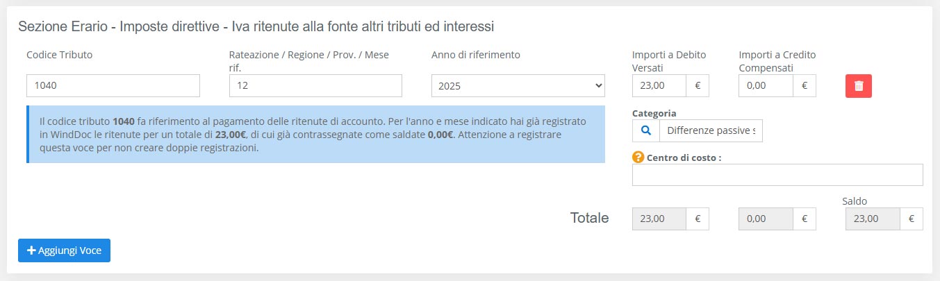 Desideriamo porre particolare attenzione su alcuni codici tributo che, in fase di registrazione, richiedono una gestione specifica in WindDoc.